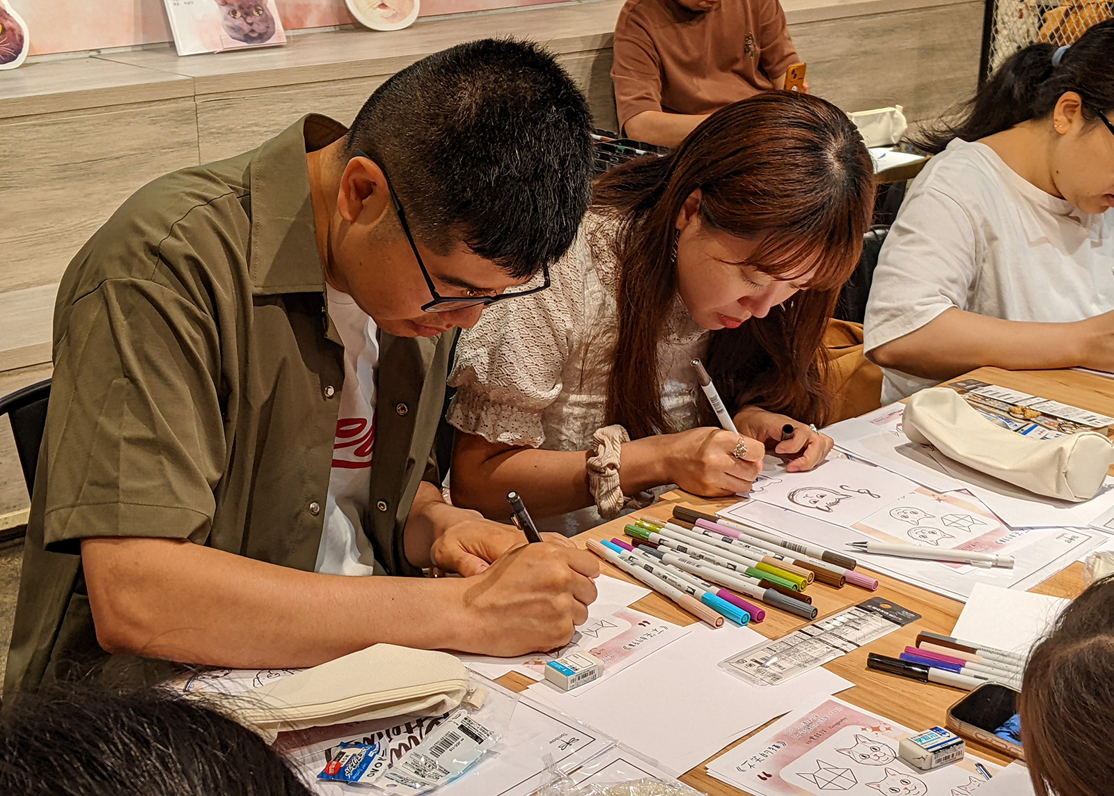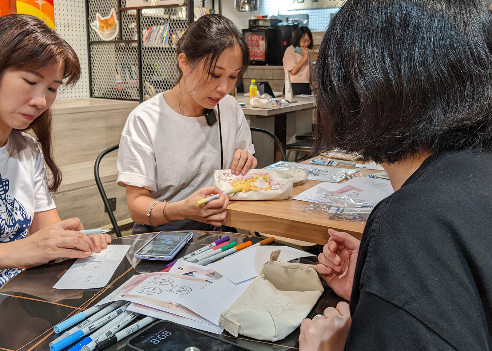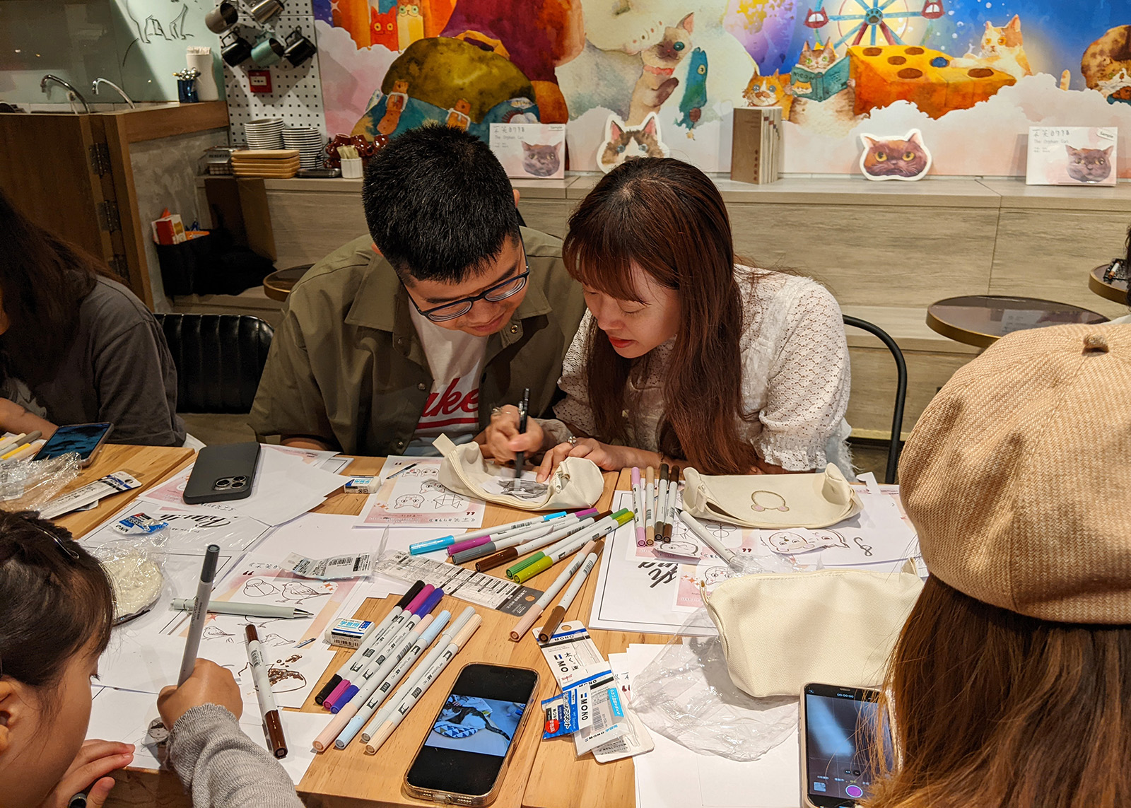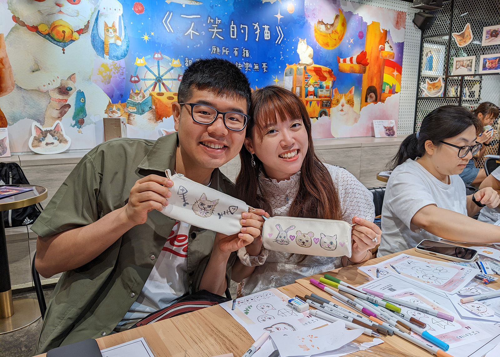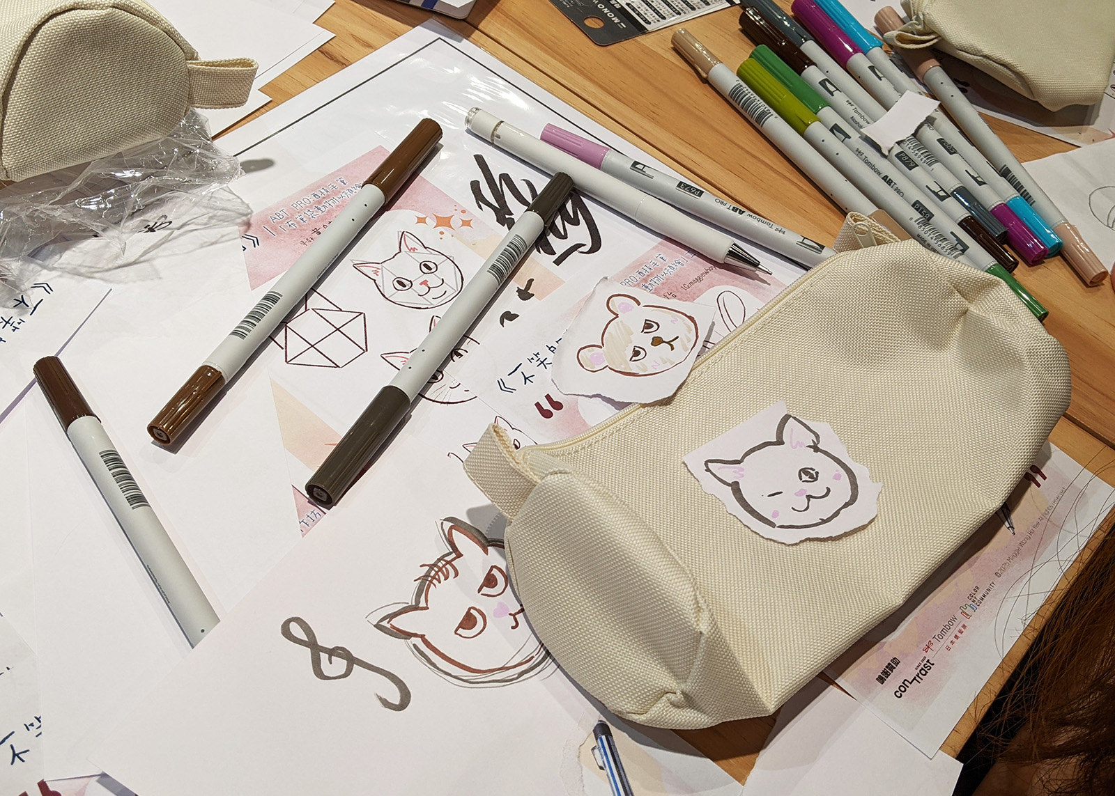 「布筆袋動物似顏繪」在貓宇宙的包圍下順利完成,《不笑的猫》繪者黃皓怡 @maggiewhoy 與參加者分享將小動物繪畫到布筆袋的心得,由運用 MONO Work 1.3MM鉛芯筆在紙張構思,到以鉛芯筆及ABTPro酒精毛筆直接在布筆袋繪畫的過程都詳細講解及示範。參加者無論大人小朋友、情侣或親子,都非常享受在貓懷抱下的溫暖氣氛創作,歡天喜地把親手繪製的動物似顏繪筆袋帶回家!