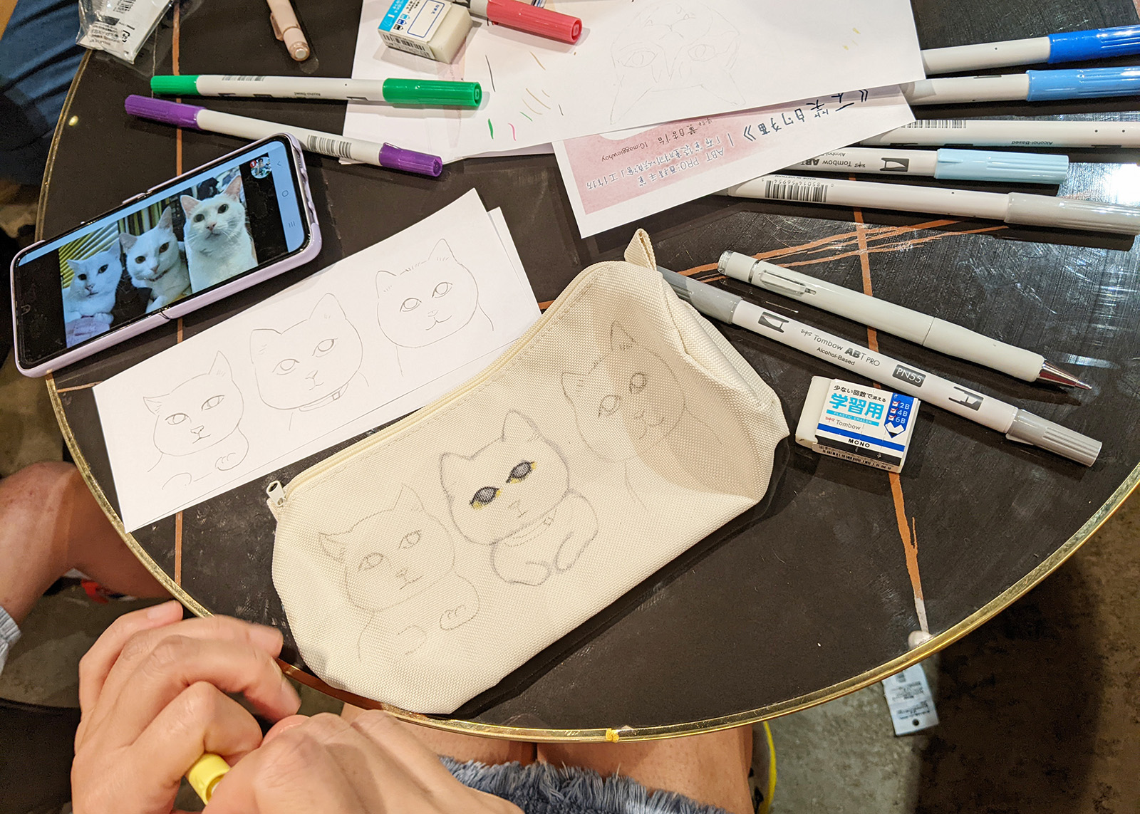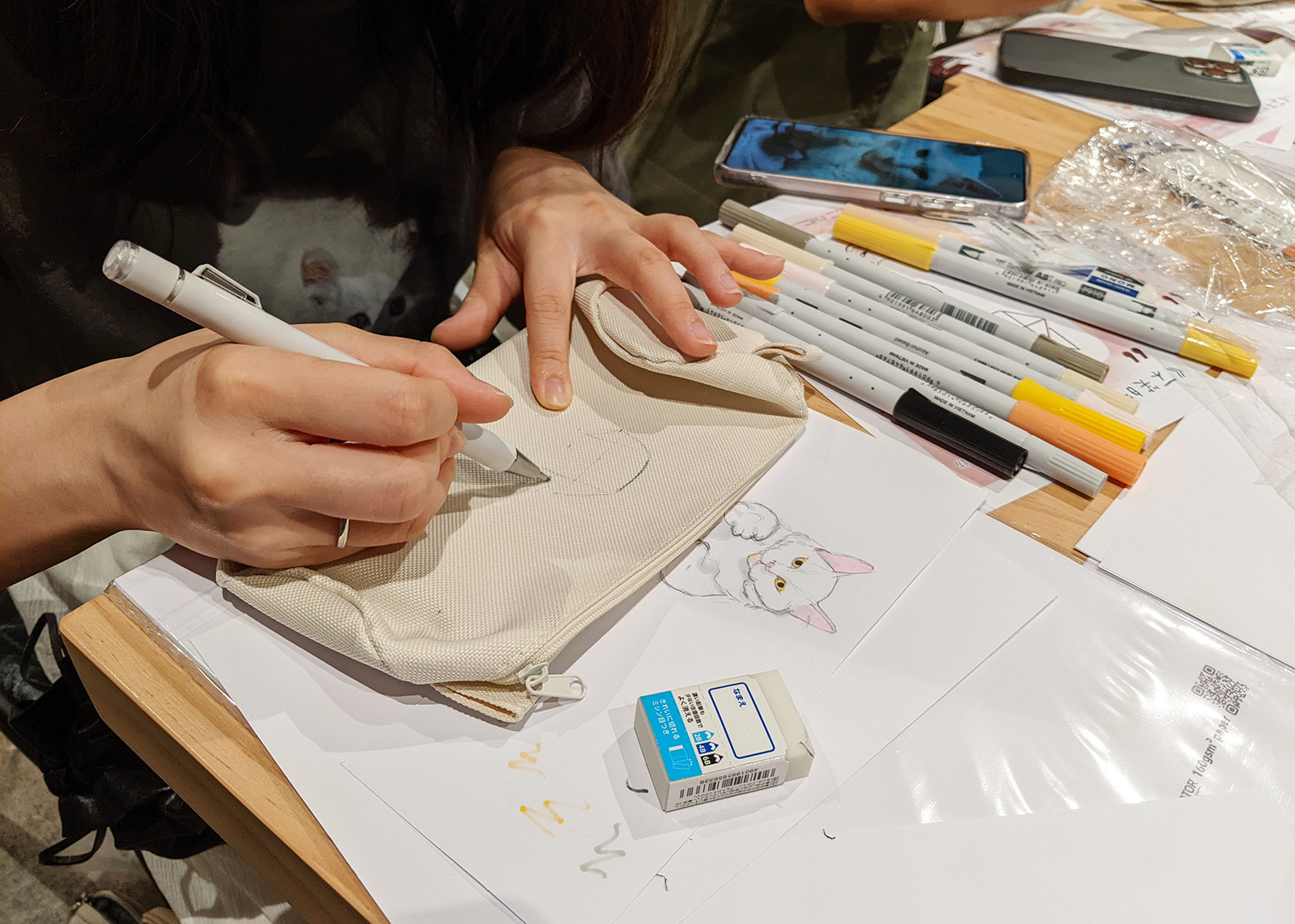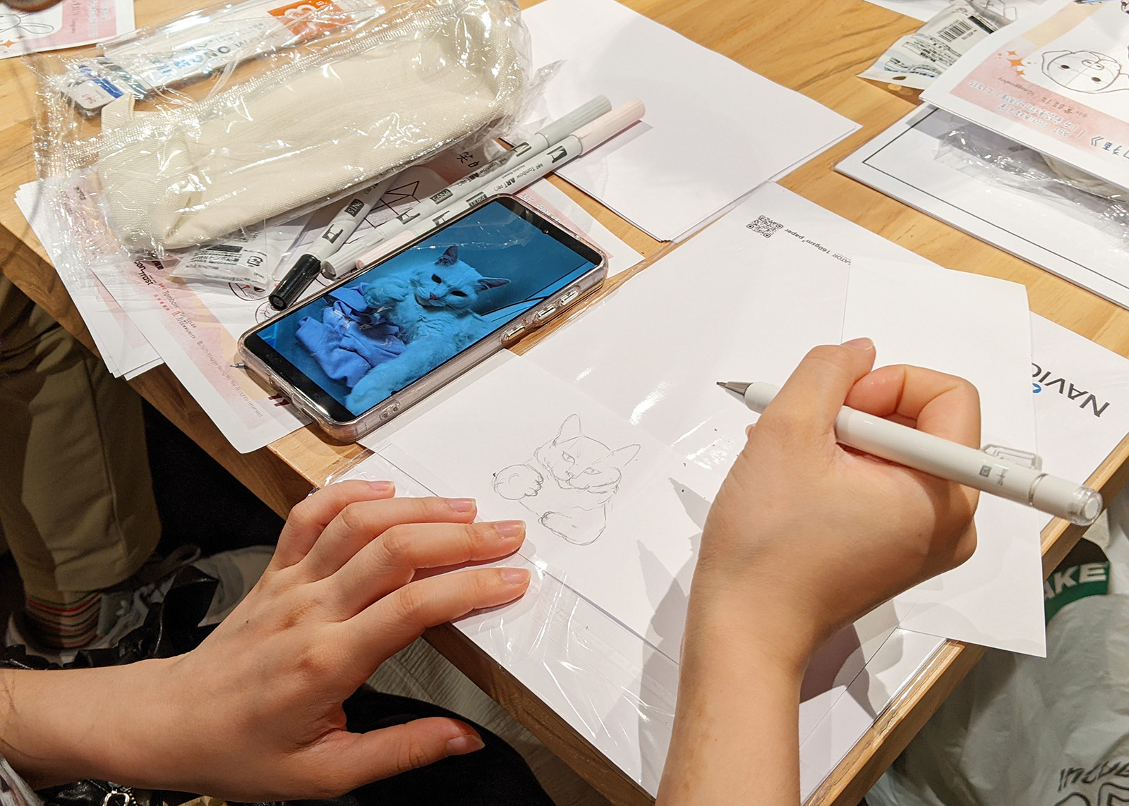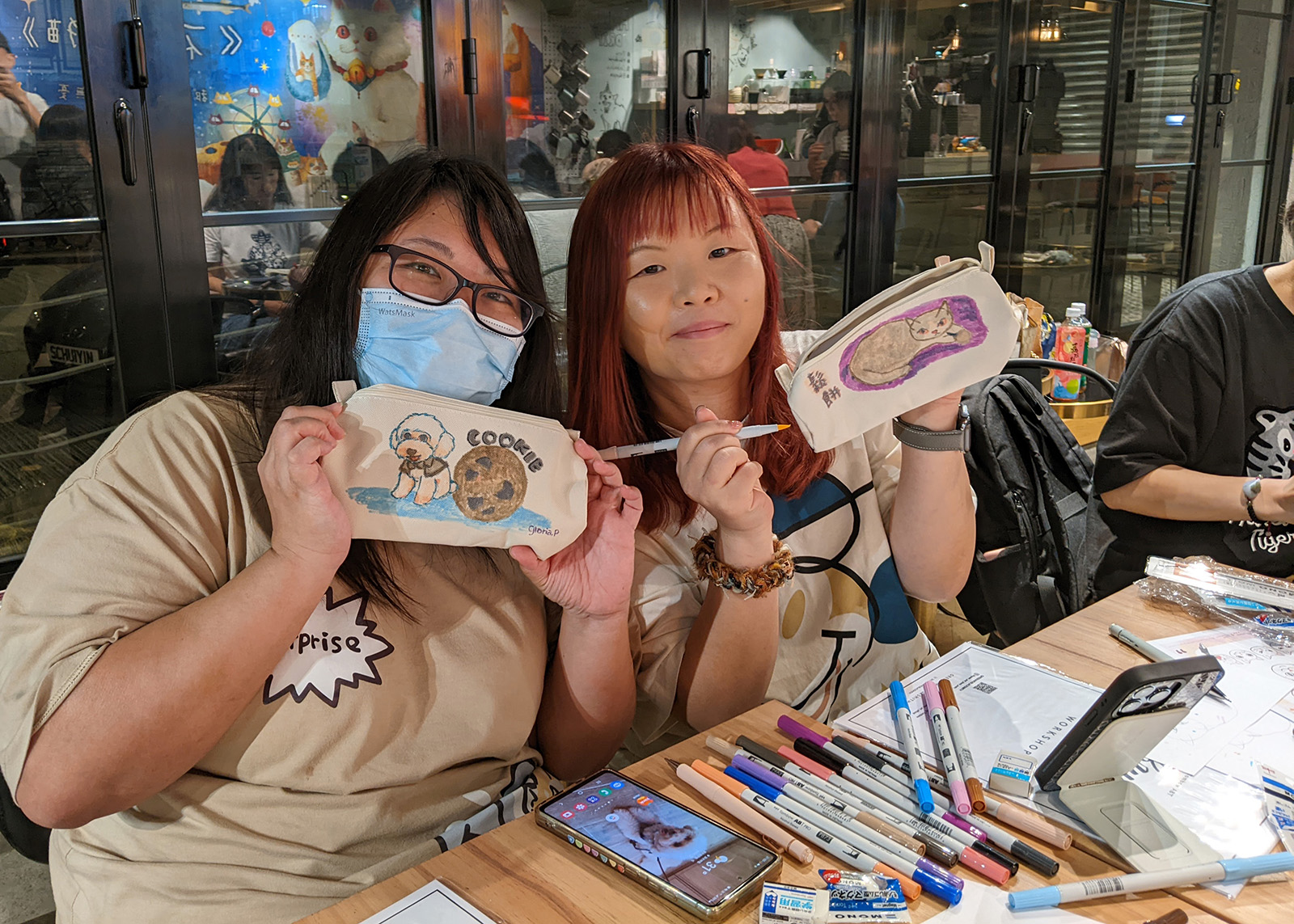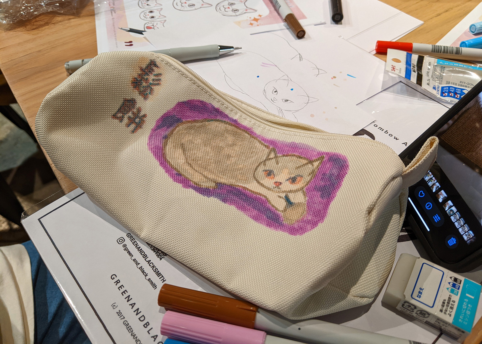 「布筆袋動物似顏繪」在貓宇宙的包圍下順利完成,《不笑的猫》繪者黃皓怡 @maggiewhoy 與參加者分享將小動物繪畫到布筆袋的心得,由運用 MONO Work 1.3MM鉛芯筆在紙張構思,到以鉛芯筆及ABTPro酒精毛筆直接在布筆袋繪畫的過程都詳細講解及示範。參加者無論大人小朋友、情侣或親子,都非常享受在貓懷抱下的溫暖氣氛創作,歡天喜地把親手繪製的動物似顏繪筆袋帶回家!