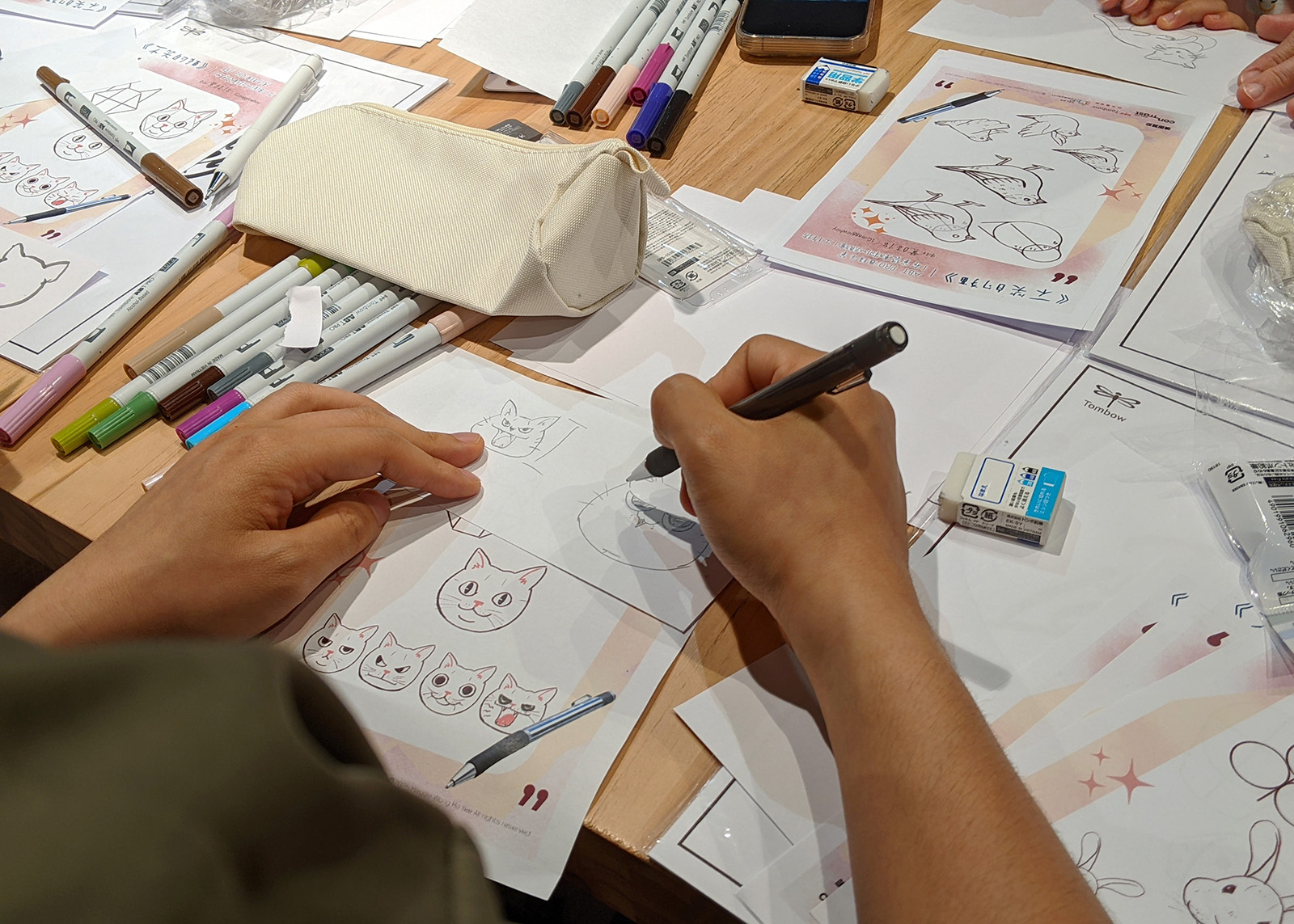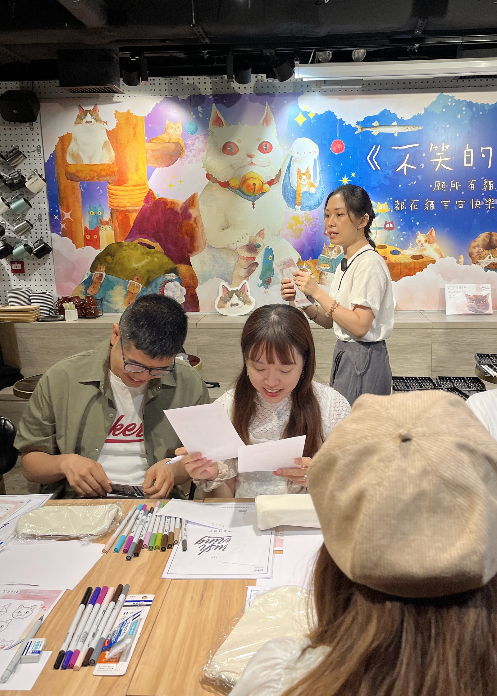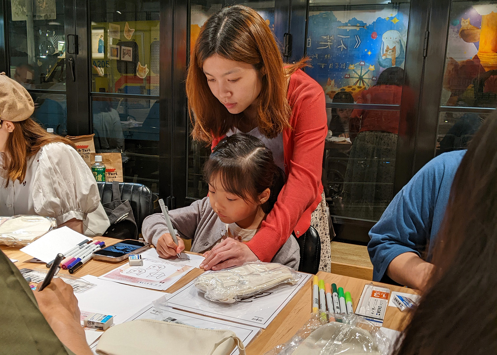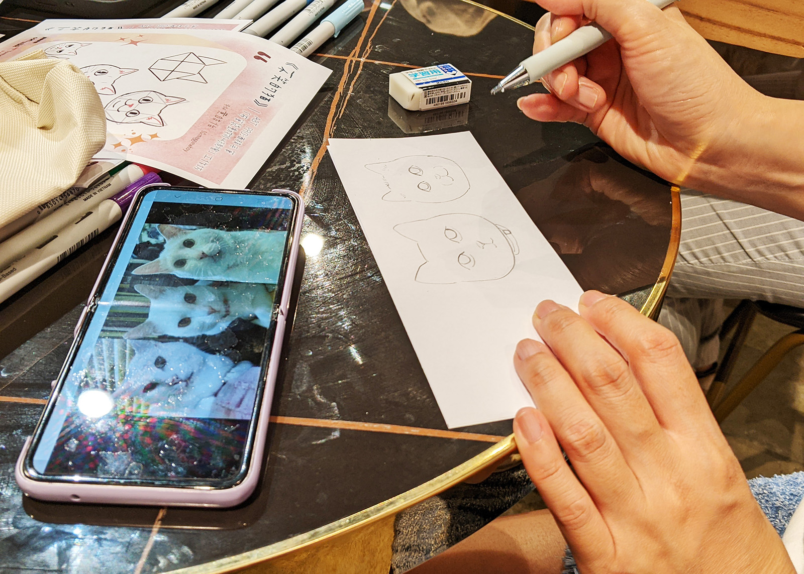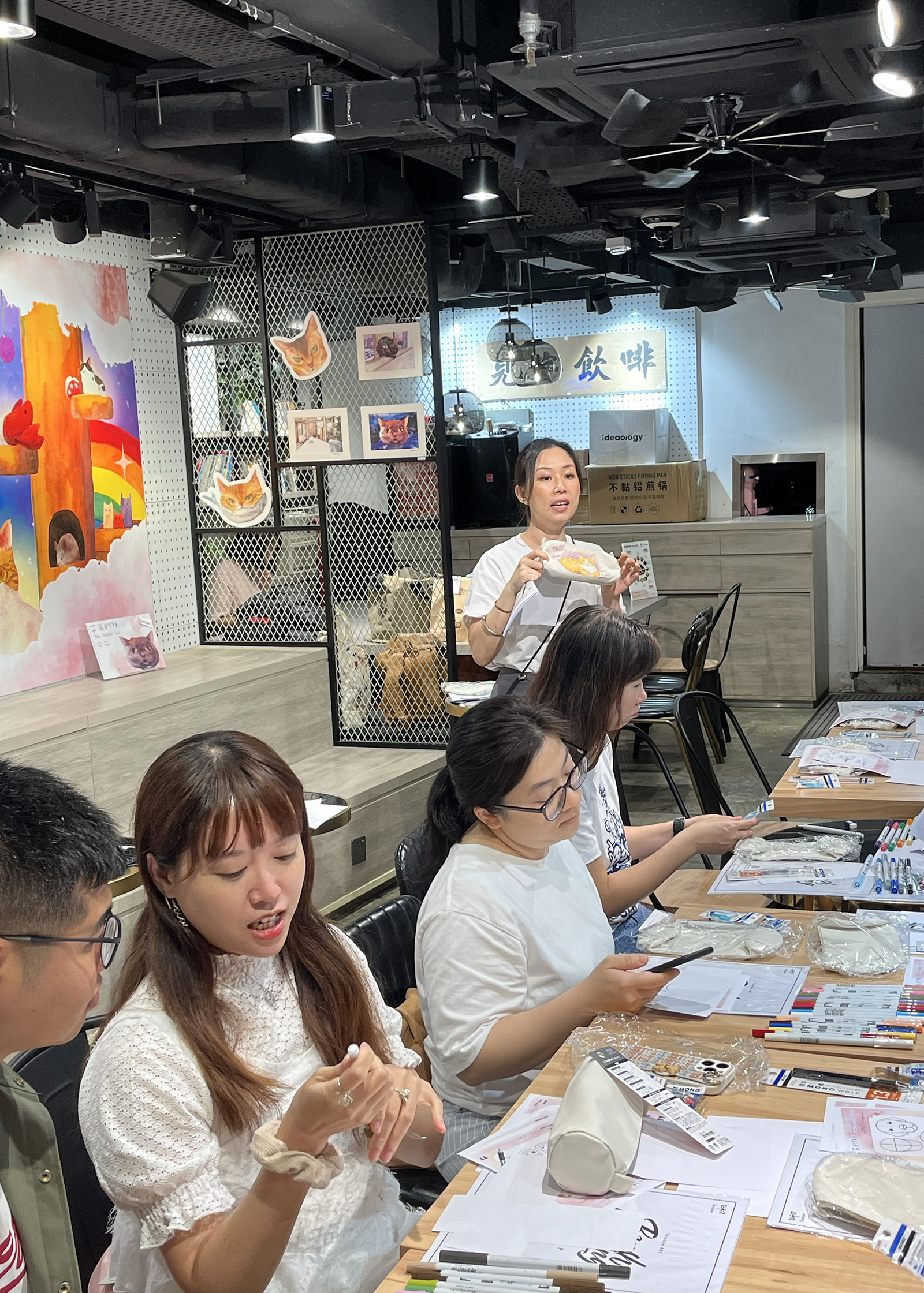 「布筆袋動物似顏繪」在貓宇宙的包圍下順利完成,《不笑的猫》繪者黃皓怡 @maggiewhoy 與參加者分享將小動物繪畫到布筆袋的心得,由運用 MONO Work 1.3MM鉛芯筆在紙張構思,到以鉛芯筆及ABTPro酒精毛筆直接在布筆袋繪畫的過程都詳細講解及示範。參加者無論大人小朋友、情侣或親子,都非常享受在貓懷抱下的溫暖氣氛創作,歡天喜地把親手繪製的動物似顏繪筆袋帶回家!