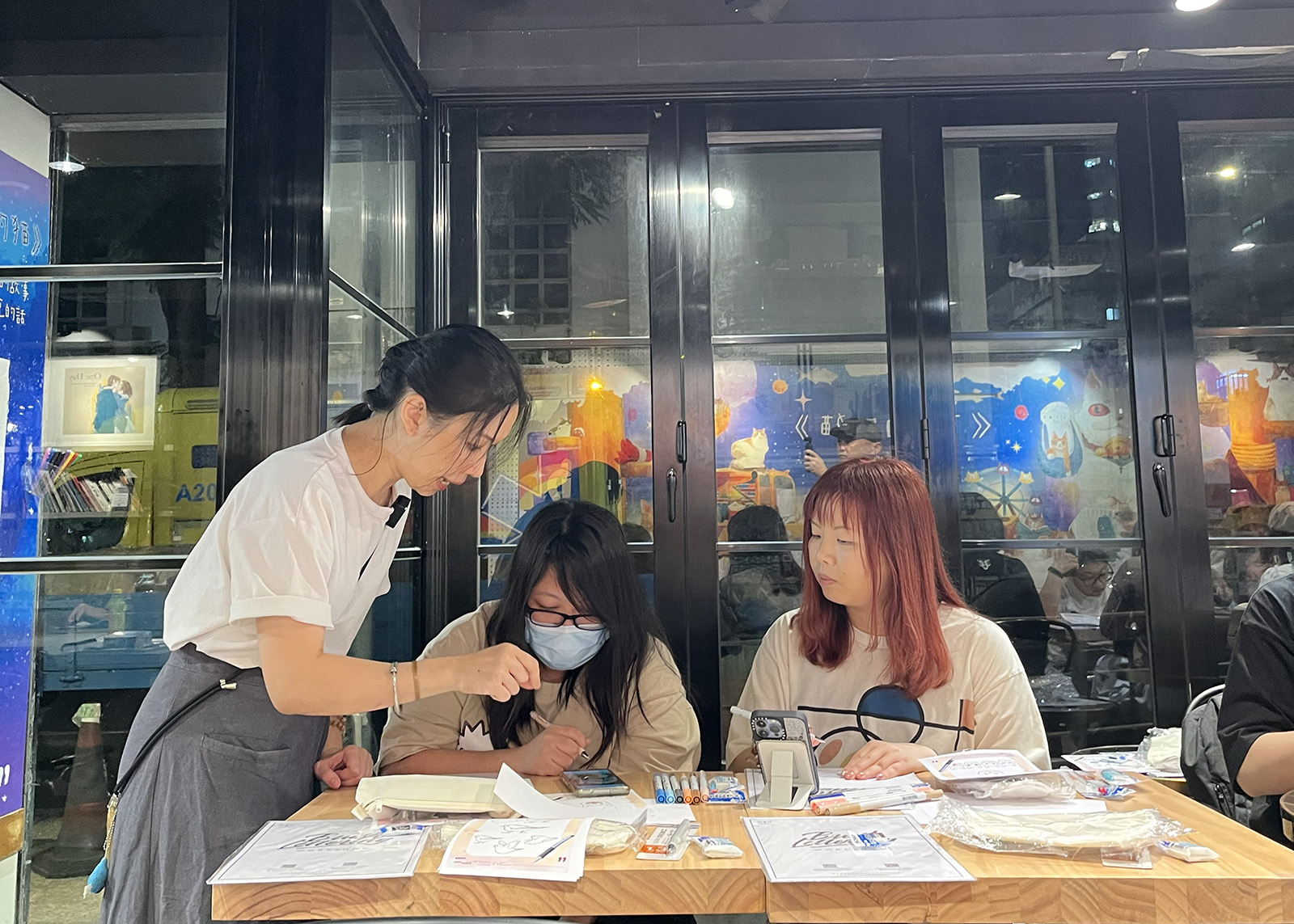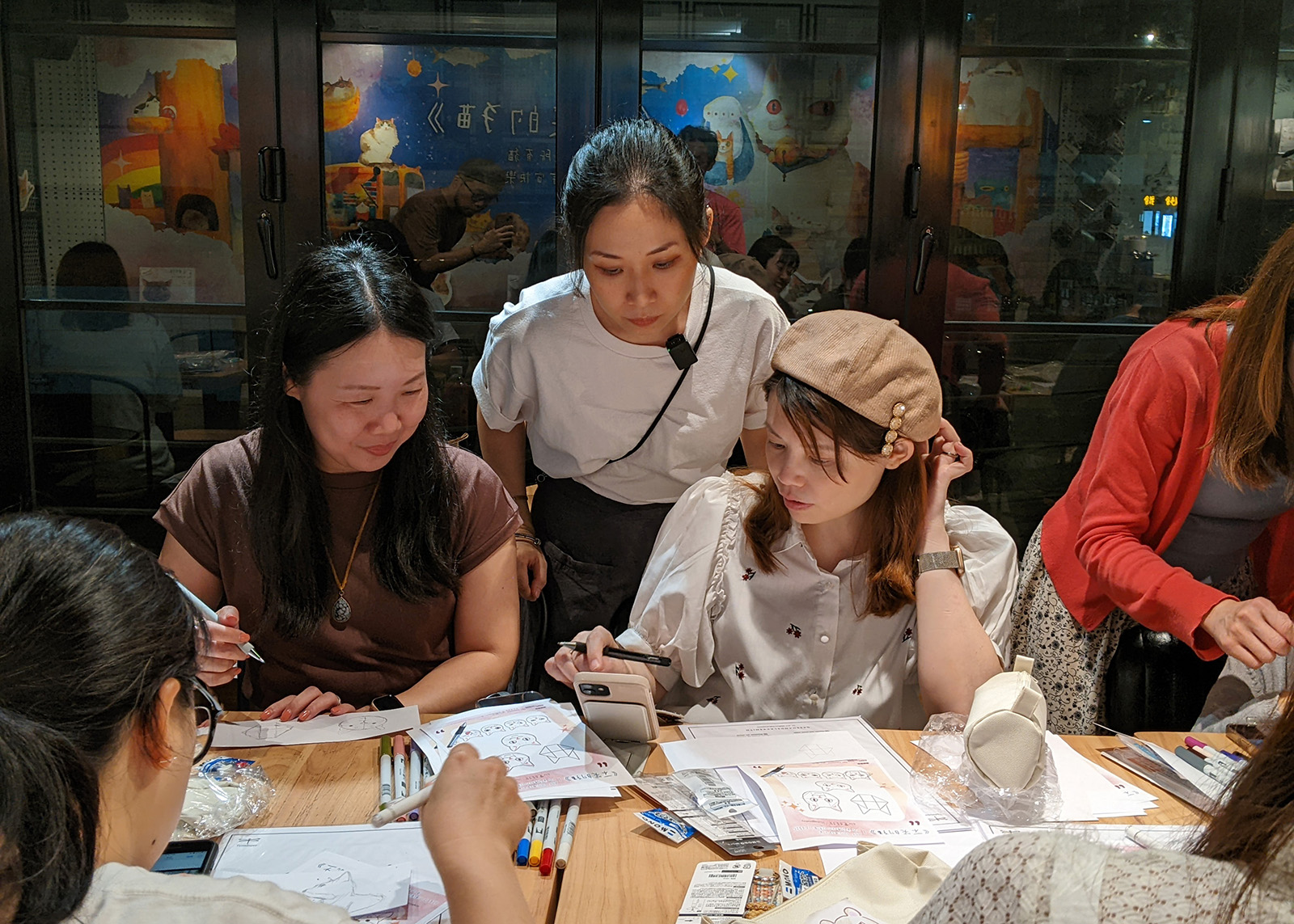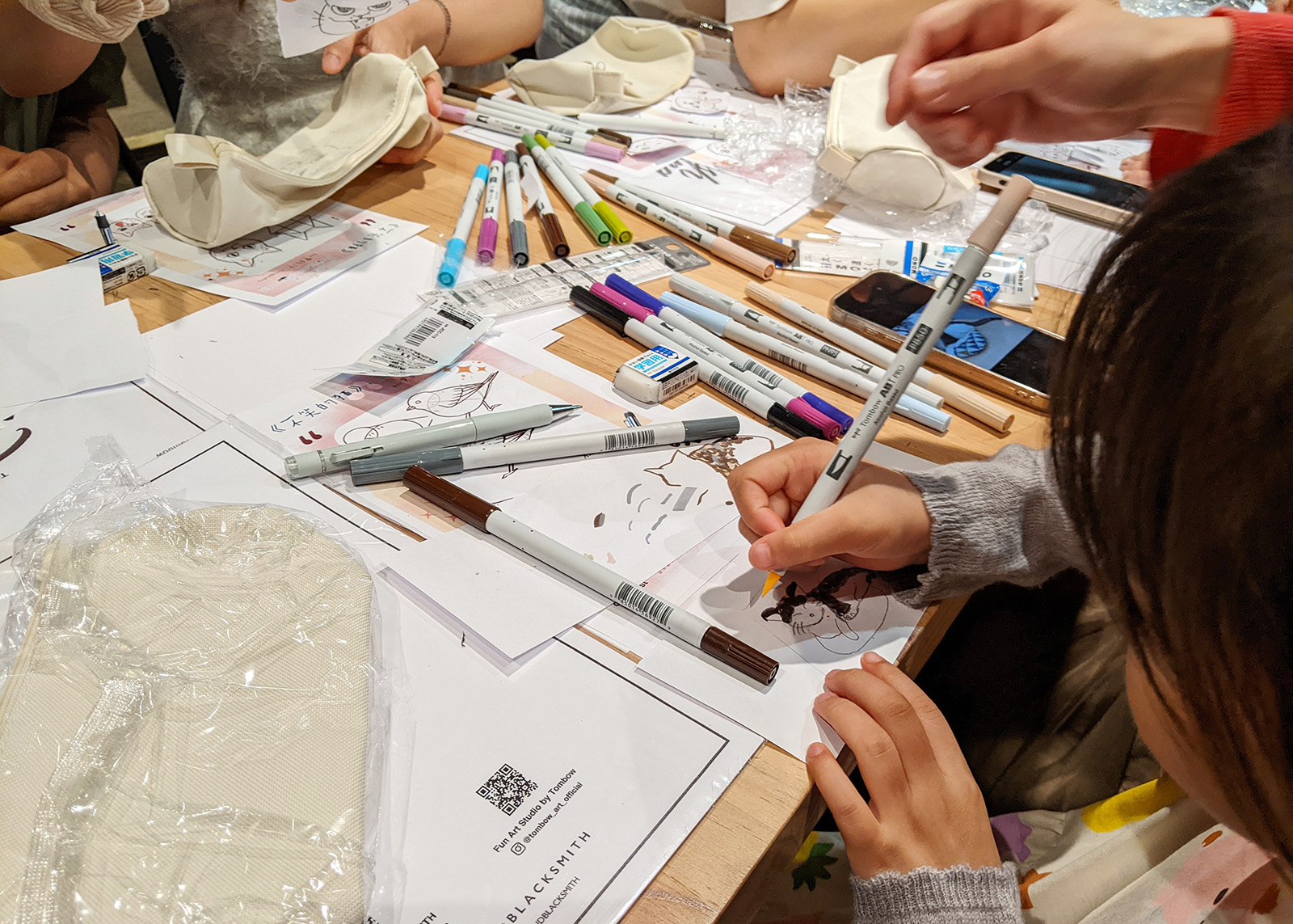 ABTPro酒精毛筆色彩飽和度高,在布料上仍能畫出鮮艷色彩,令小動物似顏繪活靈活現。Maggie 分享上色時可利用毛筆頭柔弱的特性,繪畫粗幼不同的線條和色塊增加層次感,例如以打圈的筆觸描繪小動物毛絨絨的感覺。看著布筆袋上親手繪畫的可愛的小動物,參加者都感到十分歡喜