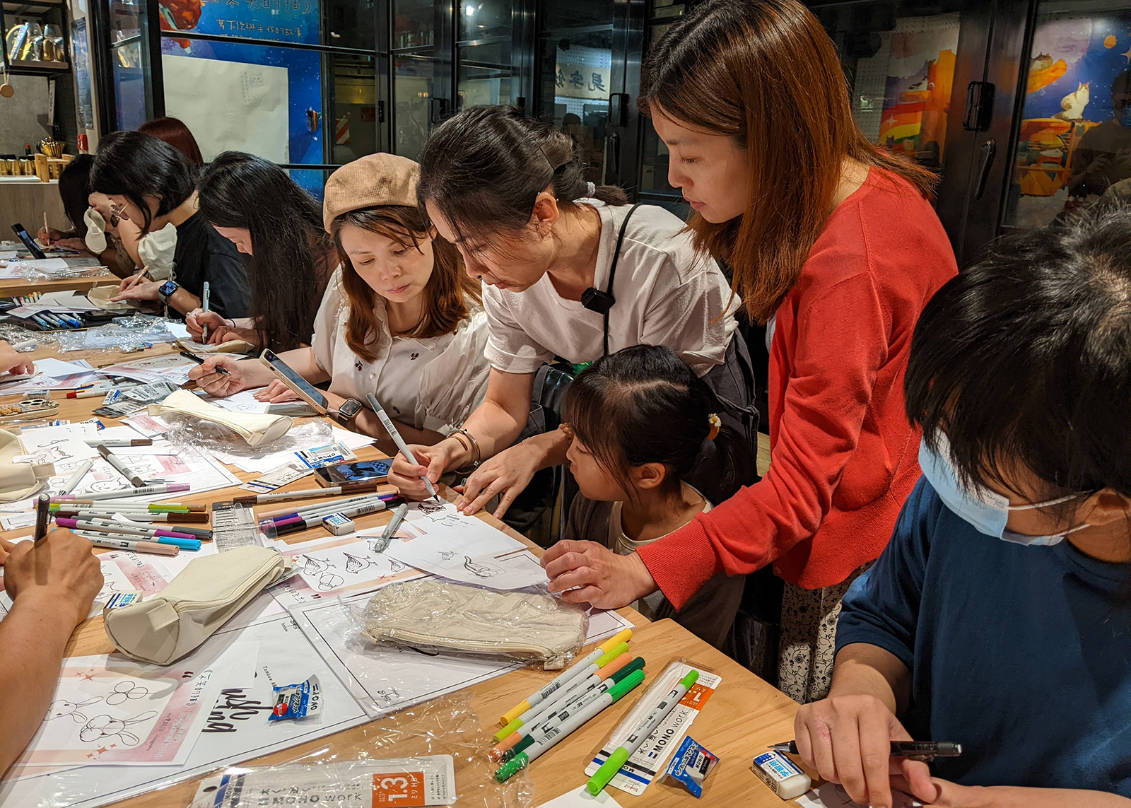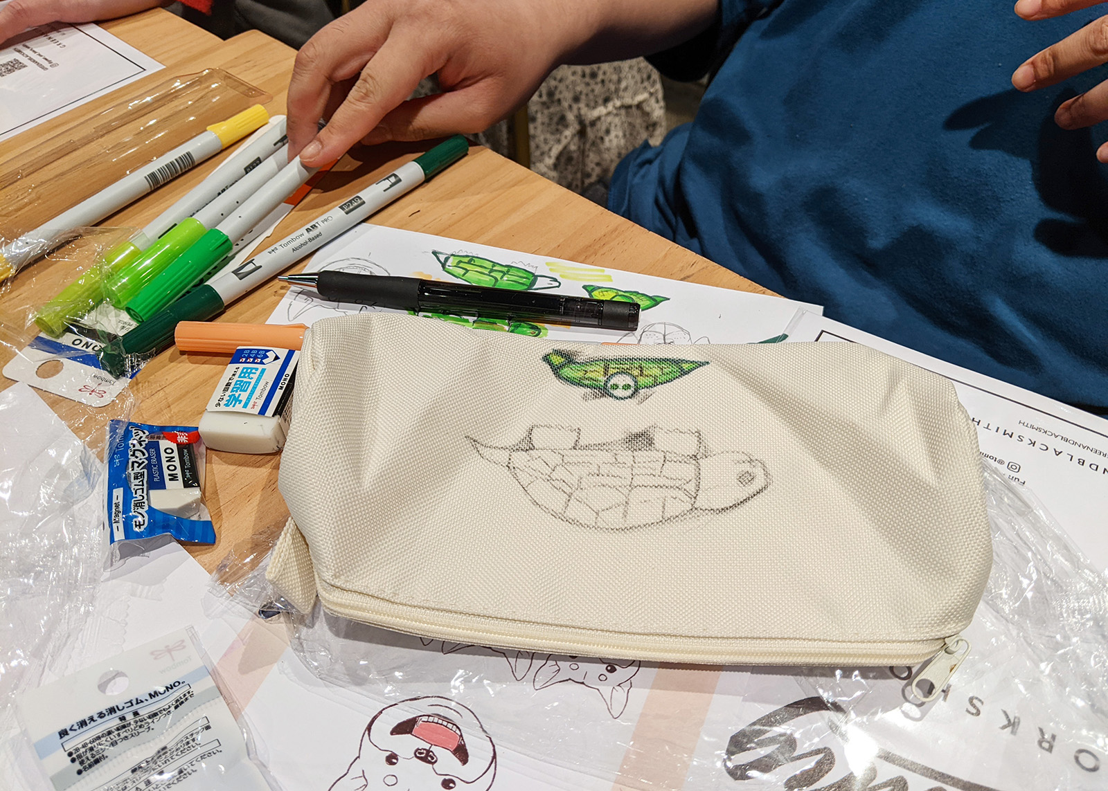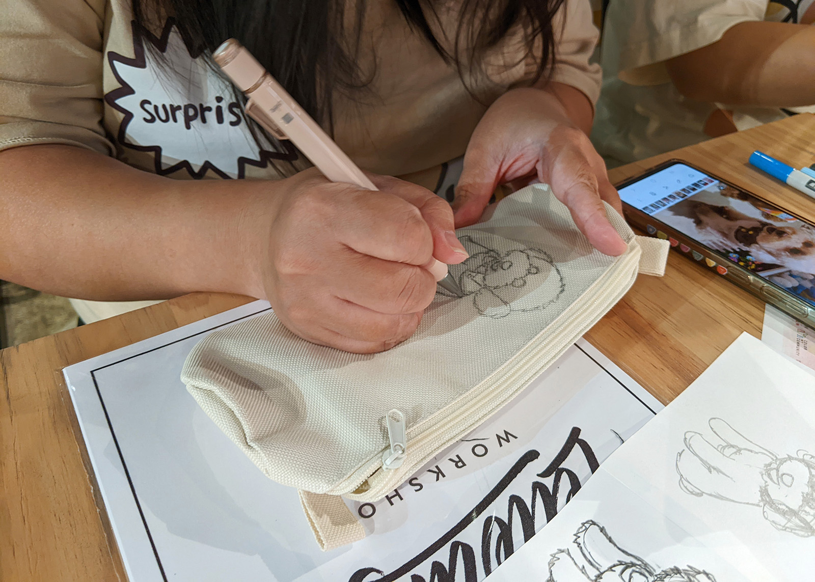 Maggie 分享以幾何圖形繪畫小動物輪廓的方法,並指導以 MONO Work 鉛芯筆在紙張起草稿,然後在布筆袋繪畫線稿的過程。MONO Work 1.3MM 粗鉛芯的特點,讓參加者可以放膽繪畫,線條清晰亦不怕斷芯,無論在紙張還是布料上都得心應手
