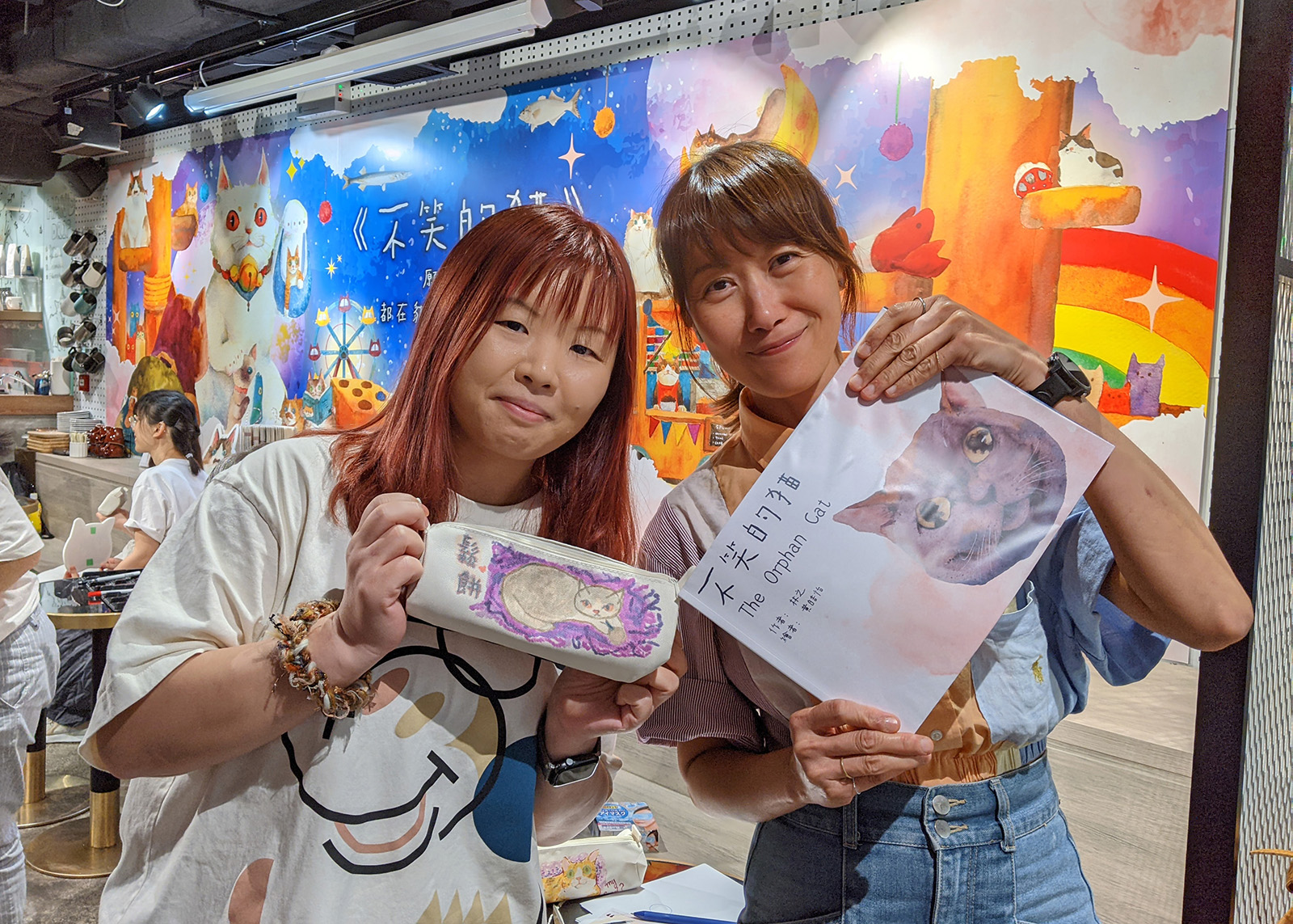 《不笑的猫》作者林之(左)及繪者黃皓怡(右)在貓宇宙的懷抱下向參加者分享繪本創作及動物似顏繪的心得